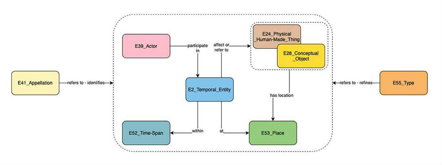 CIDOC CRM contains a list of entities (i.e., subjects) and properties (i.e., predicates). Entities are identified by the “E” prefix and properties by the “P” prefix. The core CIDOC CRM ontology consists of approximately eighty entities that can be connected through roughly two hundred properties.
