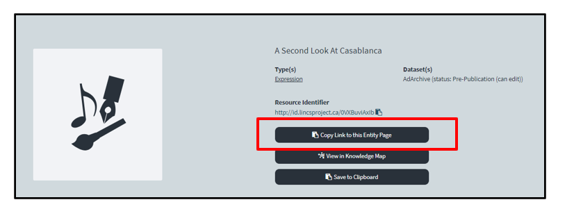 - Resource Identifier: The entity's unique IRI. The IRI may be generated by LINCS or may come from another authority like VIAF or Wikidata.