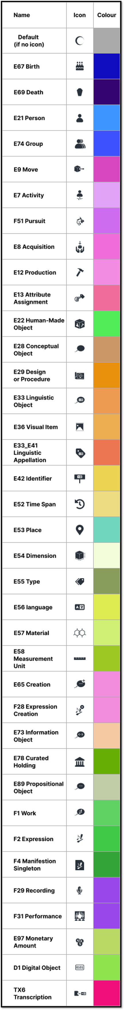 Each entity card displays the name of the entity and the CIDOC CRM class to which it belongs. The colour stripe on the top of the Entity Card is a visual cue representing the CIDOC-CRM class.