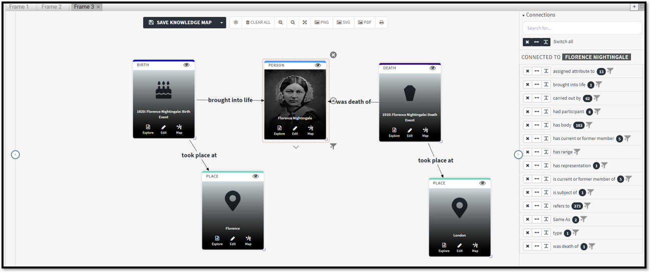 You can view all the incoming and outgoing statements connected to an entity within the Knowledge Map. The following image shows Florence Nightingale in a Knowledge Map and some of her associated connections.