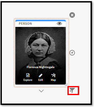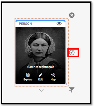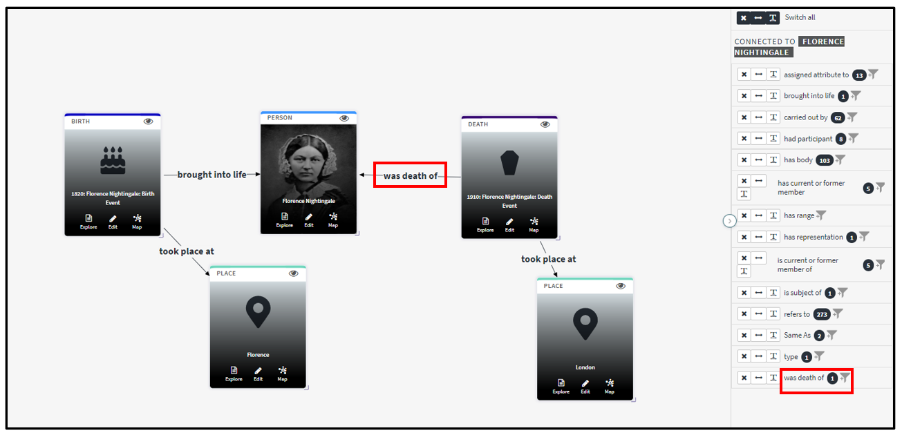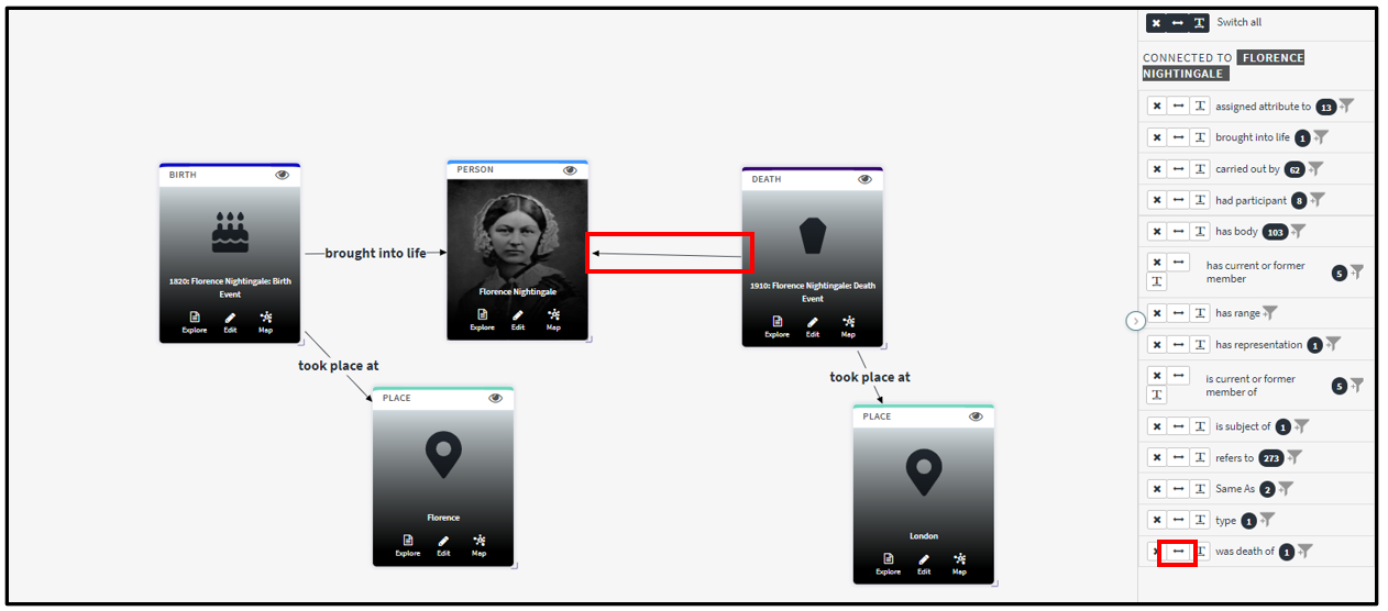 Click the X in the black box at the top of the connections panel to remove links and labels connected to the highlighted Entity Card, Florence Nightingale.