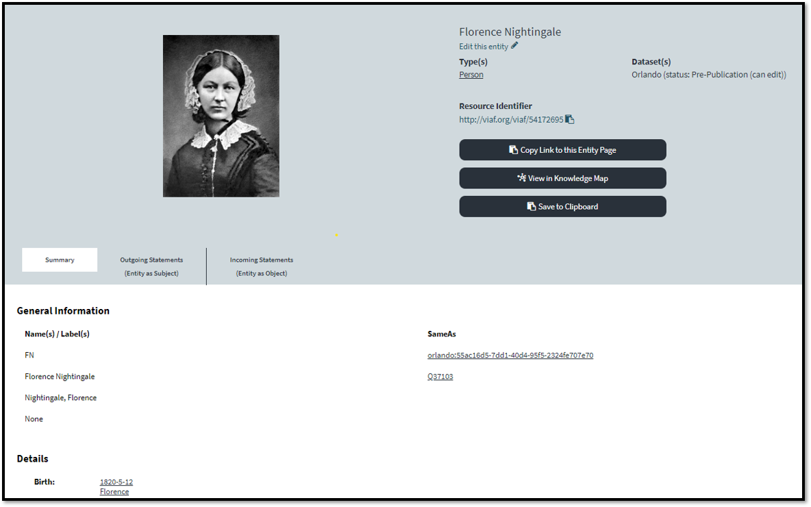 The entity summary page for the person Florence Nightingale from the Orlando dataset.