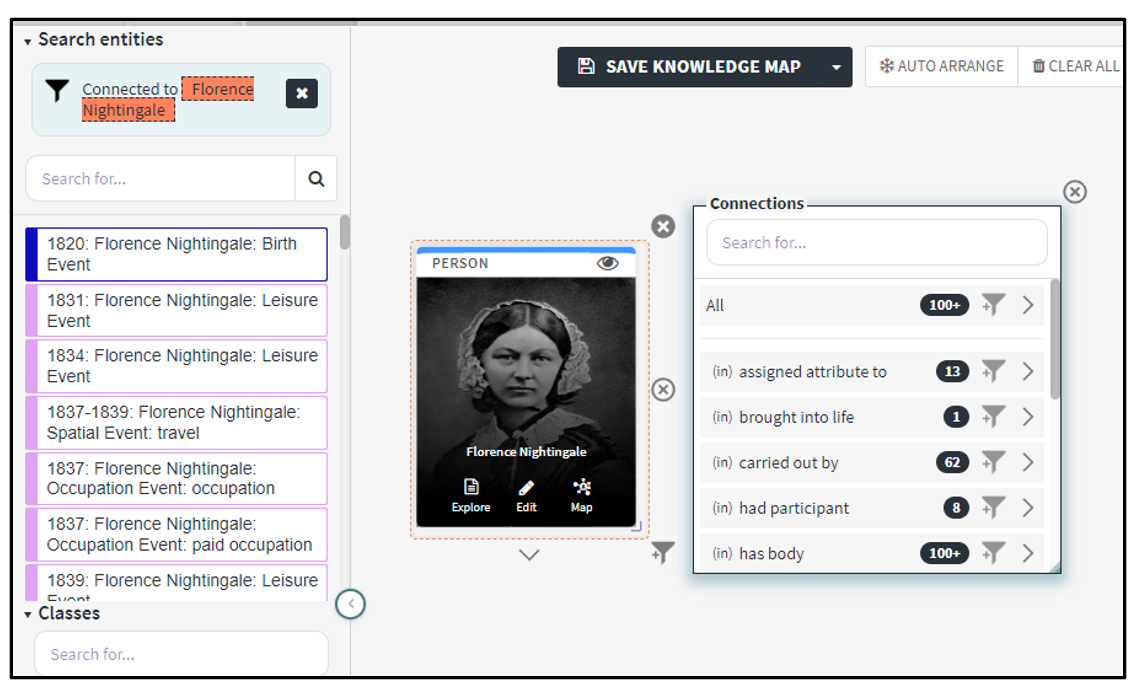 Open the connections panel to show the options for editing the links connected to the highlighted Entity Card, Florence Nightingale.