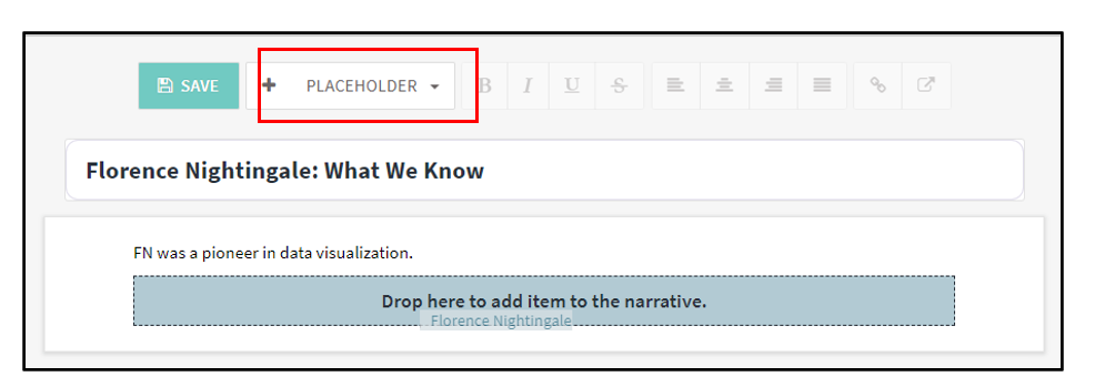 - When you hit Enter on your keyboard, the dropdown menu changes from paragraph to placeholder. This creates a spacce in your document where you can drag entities and Knowledge Maps from the saved items panel.