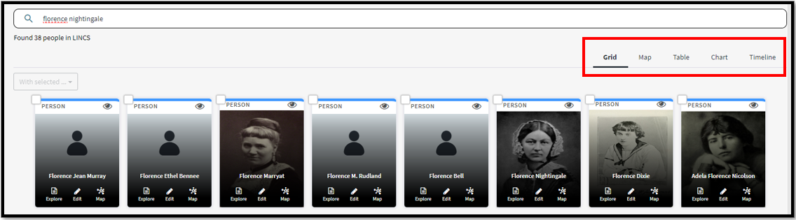 You can view results as a grid, map, table, chart, or timeline. By default, ResearchSpace displays the data as a grid of entity cards.