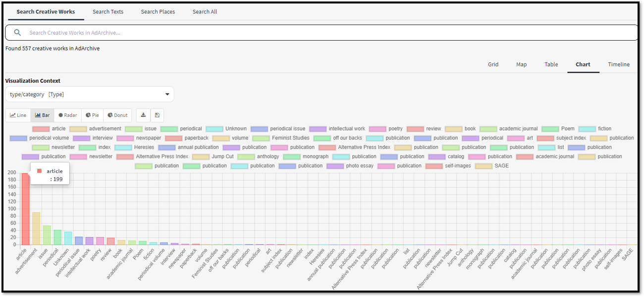 All the creative works in the AdArchive dataset are displayed by type in a bar chart. The chart shows that most of the entities classed as creative works in AdArchive are articles.