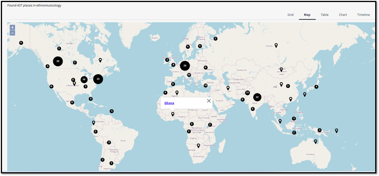 This world map shows the place data in the Ethnomusicology dataset. Ghana is highlighted.