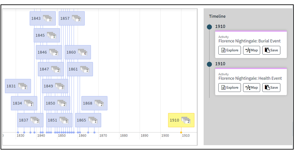 The events in the life of Florence Nightingale are displayed on the horizontal timeline. The year 1910 was an unfortunate one for Florence.