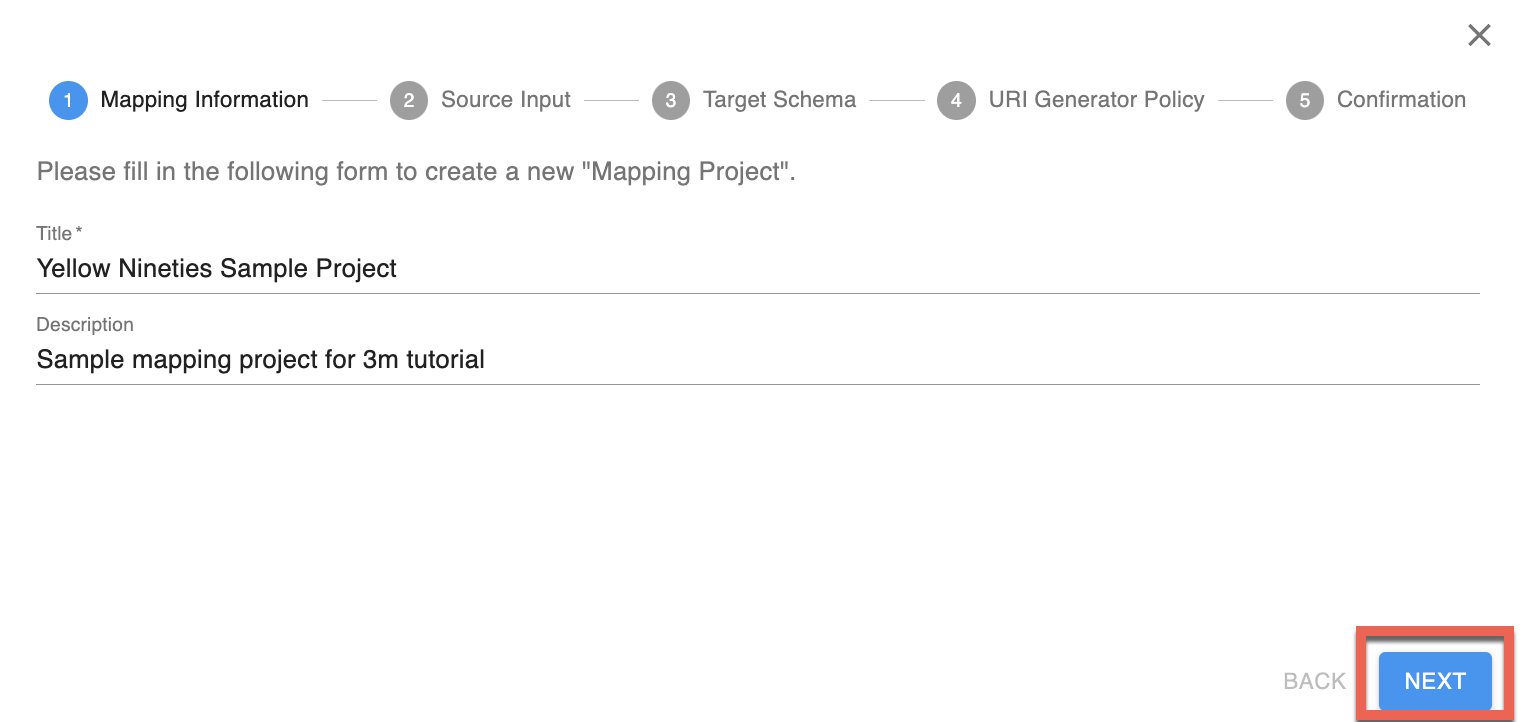 - Saisissez le Titre du projet de cartographie ainsi qu'une Description. Seul le Titre sera visible sur la page Projet Mappings. Ce Titre sera également visible par tous les autres utilisateurs de l'instance LINCS 3M.