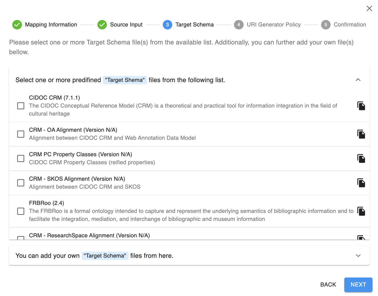 Les autres options de schéma cible préchargées présentent différentes ontologies ou extensions de l'ontologie CIDOC CRM. Elles sont utilisées pour des mappages plus complexes tels que des ensembles de données complets et dépassent le cadre de cette présentation. Pour de la documentation sur leur utilisation dans LINCS, voir LINCS Application Profile et dataset-specific application profiles.