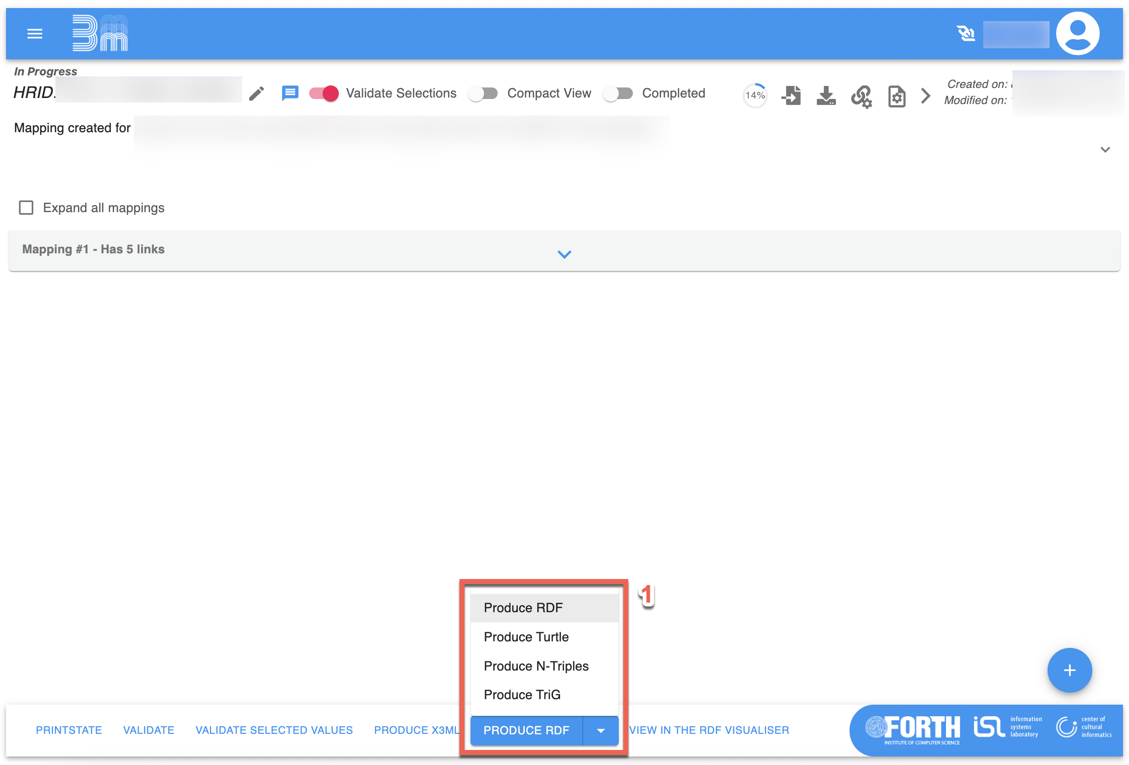 En bas de la page Mappings Overview se trouve le bouton Produce RDF. Le projet de mapping est automatiquement sauvegardé dans l'instance LINCS 3M. Pour sortir vos données converties de 3M, vous devez produire des données RDF.